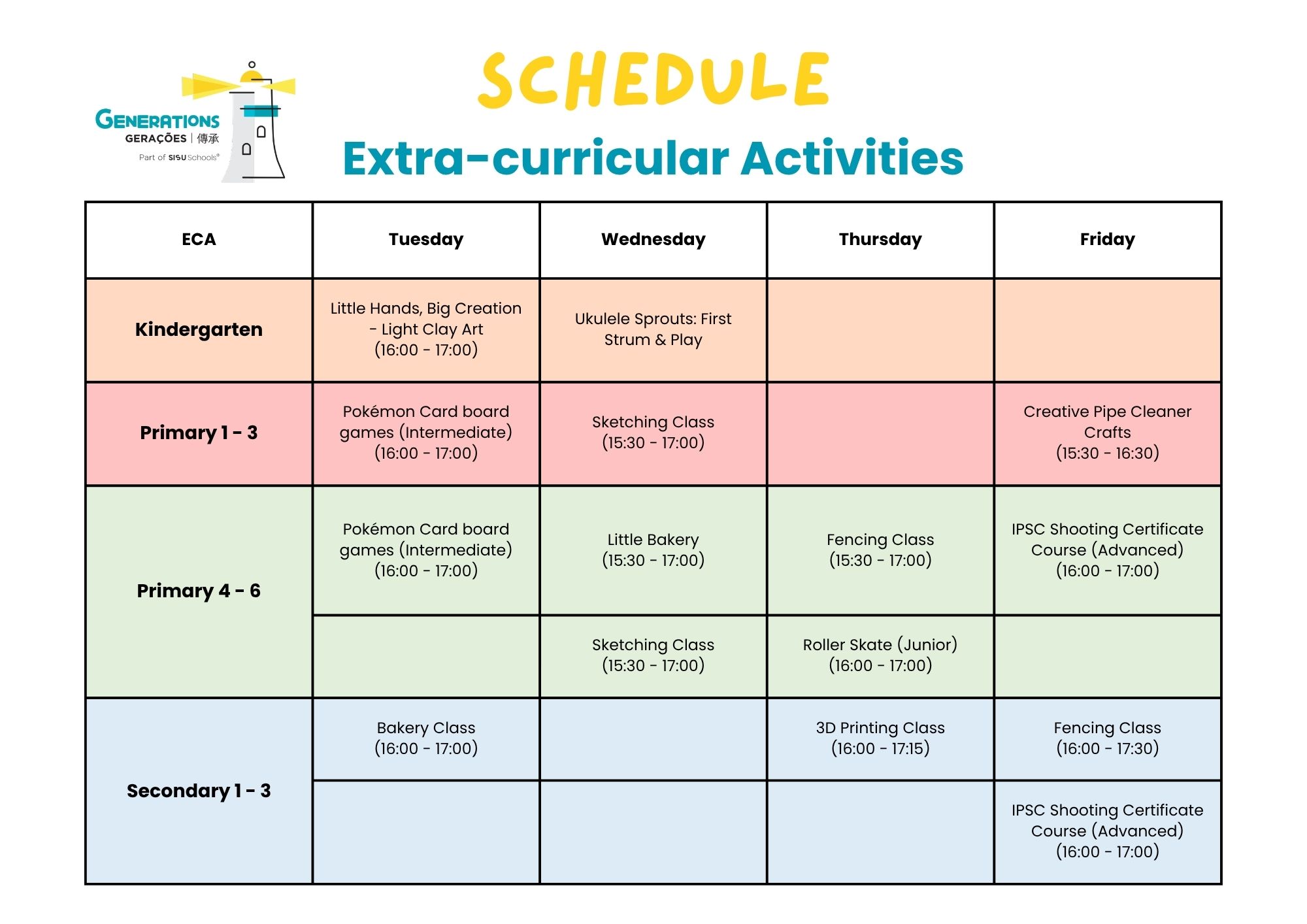 Activities are thoughtfully curated to cater to different age groups and proficiency levels, ensuring inclusivity and personalized growth. The programme also includes special events and seasonal camps, such as the partnership with Benfica Macau for football and basketball training, which inspire students to challenge themselves while building confidence and resilience. With dedicated staff and a supportive community, Generations’ extracurricular offerings empower students to explore their passions, develop new skills, and cultivate lifelong friendships, all contributing to their holistic development as well-rounded global citizens.