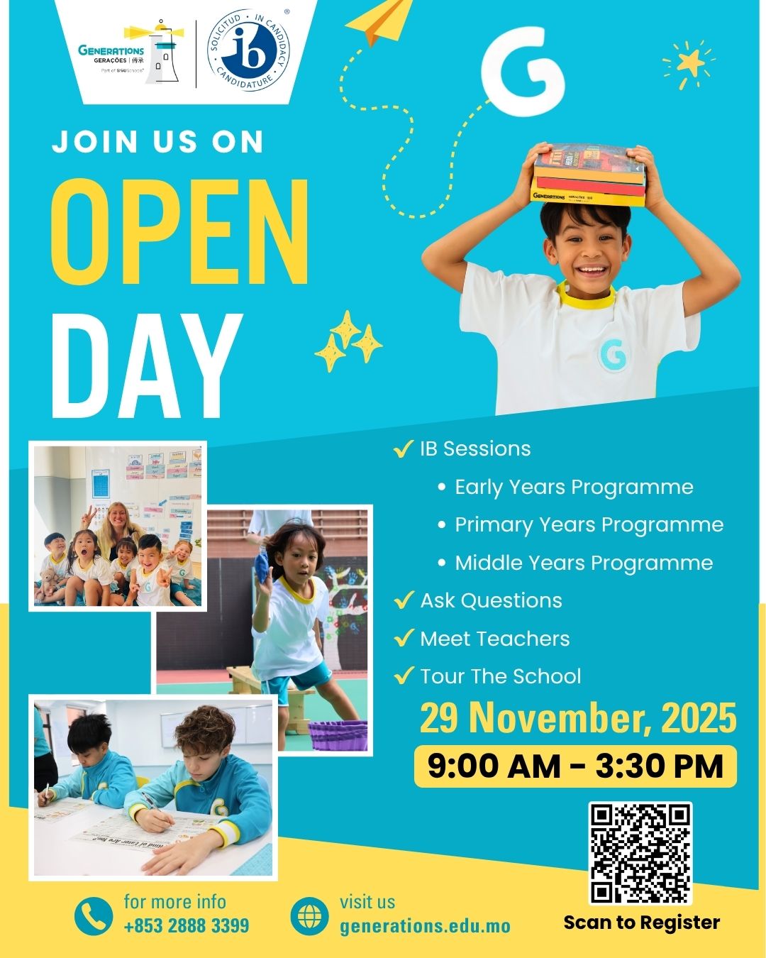 GENERATIONS is excited to welcome prospective families to our upcoming Open Day to be held on 29th November 2025 from 9.30am to 12.30pm, a unique opportunity to discover what makes GENERATIONS a leading choice in international education in Macau. The Open Day is designed to provide an immersive experience into our academic and holistic wellbeing programmes, and our vibrant school community.